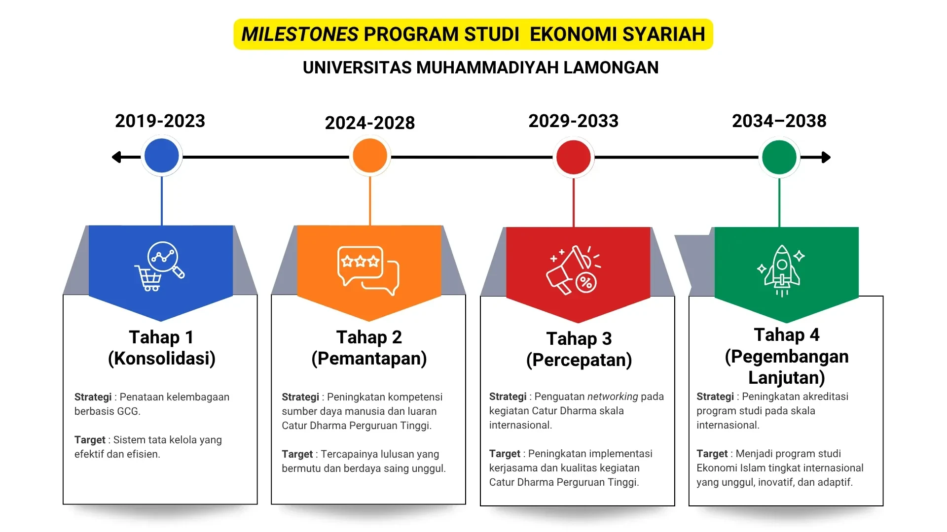 Milestone Program Studi S1 Ekonomi Syariah Universitas Muhammadiyah Lamongan menggambarkan tahapan pengembangan dari konsolidasi tata kelola (2019–2023), pemantapan kualitas SDM dan lulusan (2024–2028), percepatan jejaring internasional (2029–2033), hingga pengembangan lanjutan menuju akreditasi dan reputasi global (2034–2038).